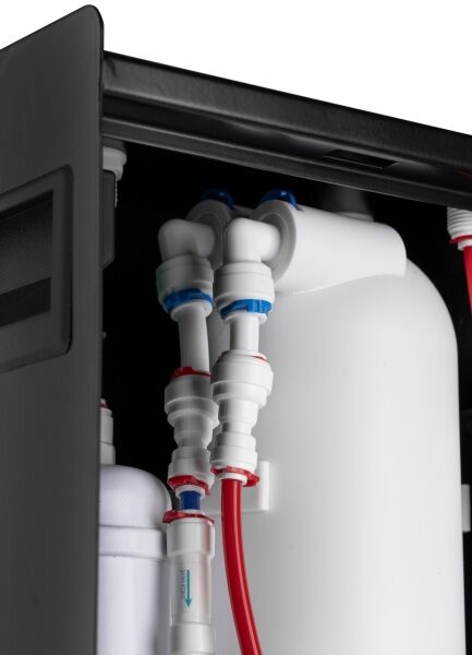 Το καθαρό νερό (διήθημα) εισέρχεται στη βρύση καθαρού νερού, ενώ τα στερεά απόβλητα, άλατα και τα κατάλοιπα εκτρέπονται στη γραμμή αποστράγγισης.